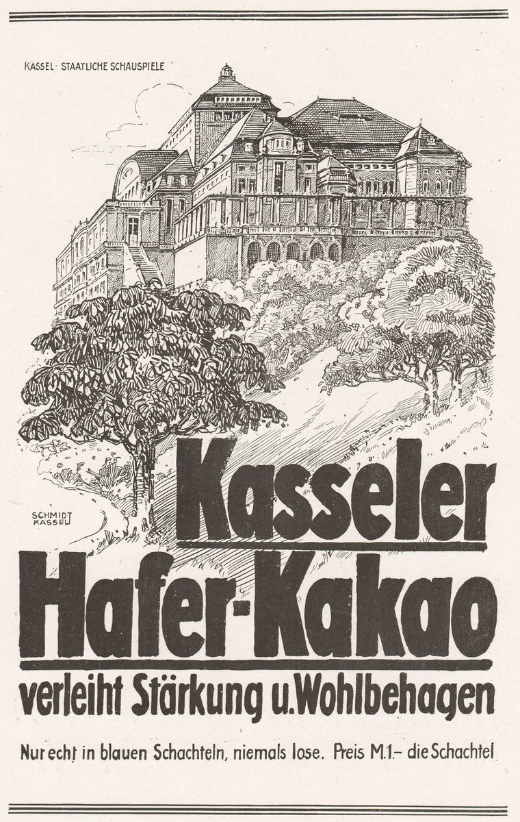 Reklame für den Kasseler Hafer-Kakao und der Blick auf die Südwest-Seite des Preußischen Theaters