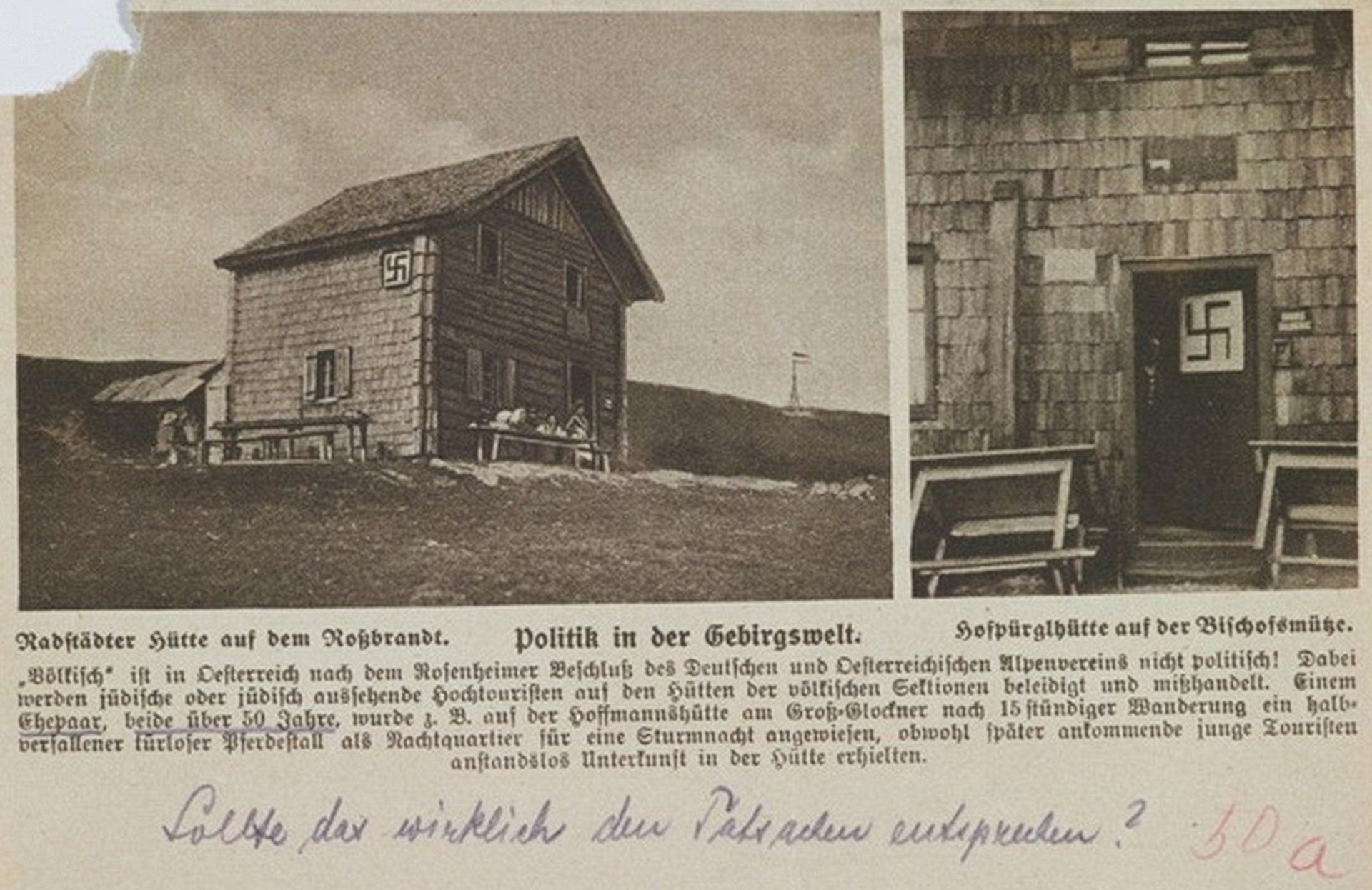 Die Alpenvereine aus Deutschland und Österreich schlossen sich 1873/74 zusammen und verstanden sich als Vertreter einer großdeutschen politischen Lösung. Insbesondere die Vertreter der österreichischen Sektionen betonten ihr Deutschtum. Nachdem Deutschland als Folge des 1. Weltkriegs Teile des Staatsgebiets verloren hatte und Österreich Südtirol - ein beliebtes alpinistisches Betätigungsfeld - an Italien abtreten musste, steigerte sich der Nationalismus noch einmal. Damit einher ging ein Antisemitismus, der schon Ende des 19. Jahrhunderts in vielen Sektionen zur Nichtaufnahme von jüdischen Menschen geführt hatte. Besonders deutlich wurde die antisemitische Haltung bei den Auseinandersetzungen um den Ausschluss der 1921 von jüdischen und liberalen Bergsteigern gegründeten Wiener Sektion „Donauland“ aus dem Verein.