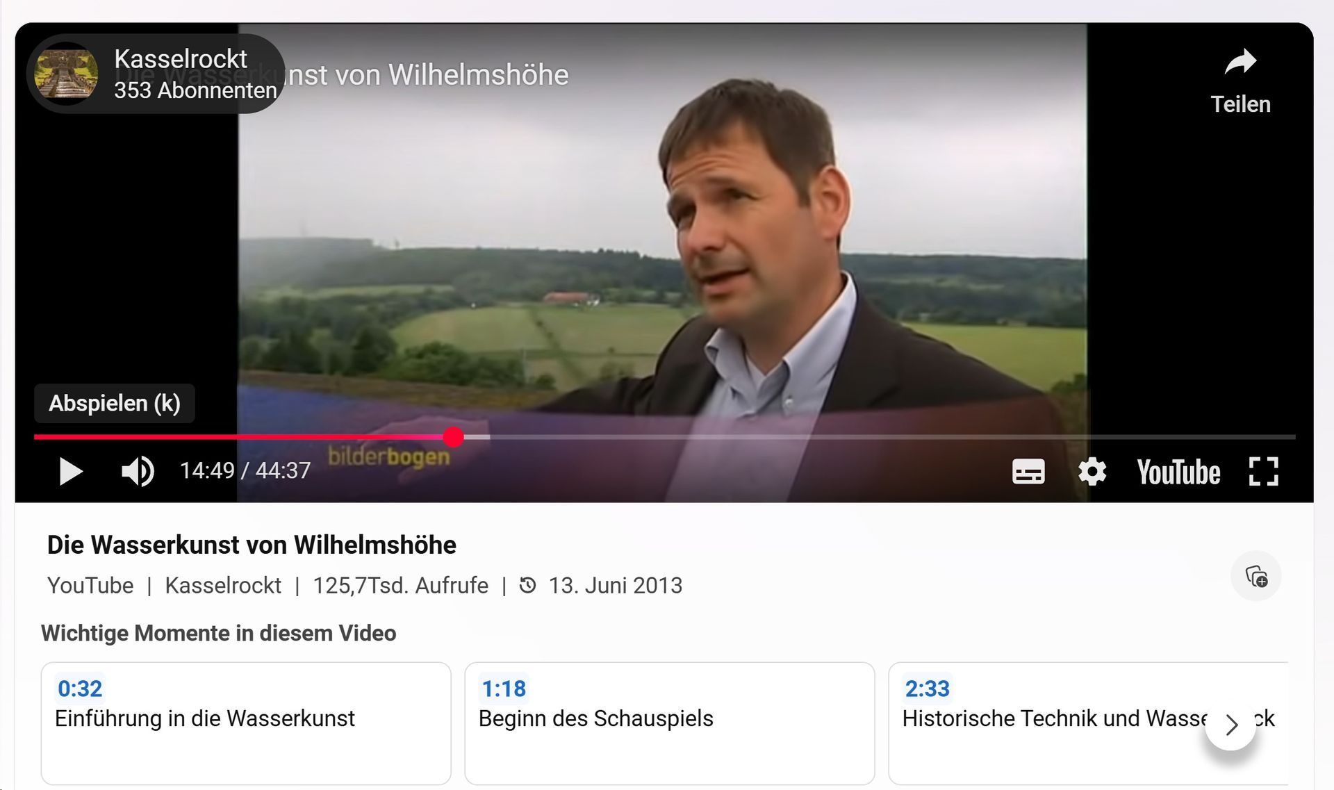 Der Filmbeitrag des Hessischen Rundfunks informiert bestens über die Wasserbilder und Wassertheater. Ausführlich wird auch gezeigt und erklärt, wie es gelingt, die Wasser vom Berg, also von oben kommen zu lassen und den Wasserspielen zuzuführen.