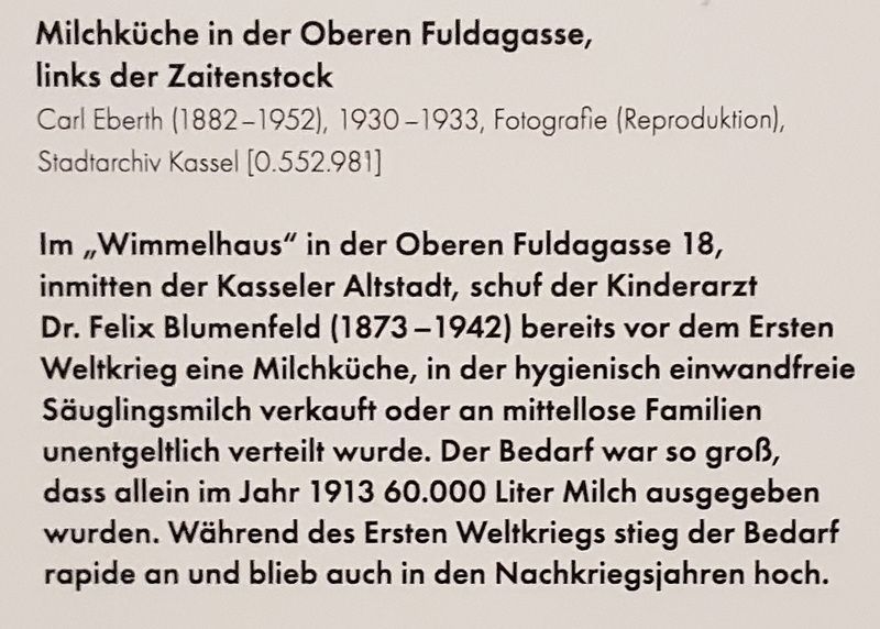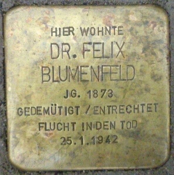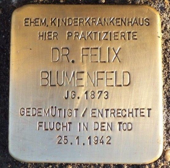 Der seit 1901 in Kassel praktizierende Kinderarzt Felix Blumenfeld ist bis heute als Gründer der in der Altstadt ansässigen Milchküche und als medizinischer Leiter des späteren Kinderkrankenhauses Park Schönfeld bekannt. An den jüdischen Mediziner, der 1942 als Opfer des NS-Rassenhasses und antisemitischer Verfolgung in den Selbstmord getrieben wurde, erinnern zwei