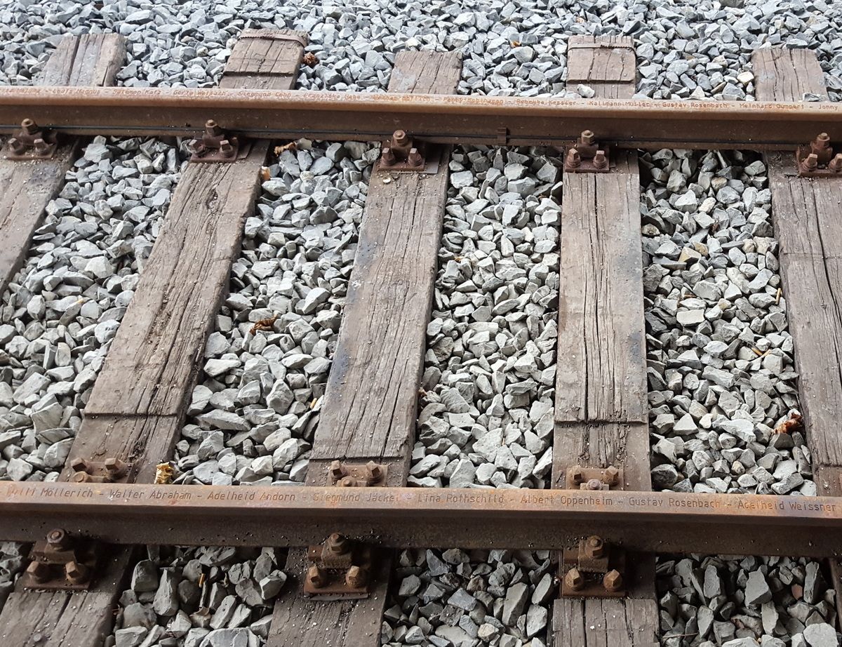 "Dieses Gleis zur Erinnerung an die ‚Entgleisung‘ aller menschlichen Normen durch die Nationalsozialisten wird nie mehr befahren werden. Es ist jetzt ein Ort der Erinnerung. Die in die Schienen gravierten Namen sind so groß, dass man sie beim Abschreiten des Bahnsteigs gut lesen kann."