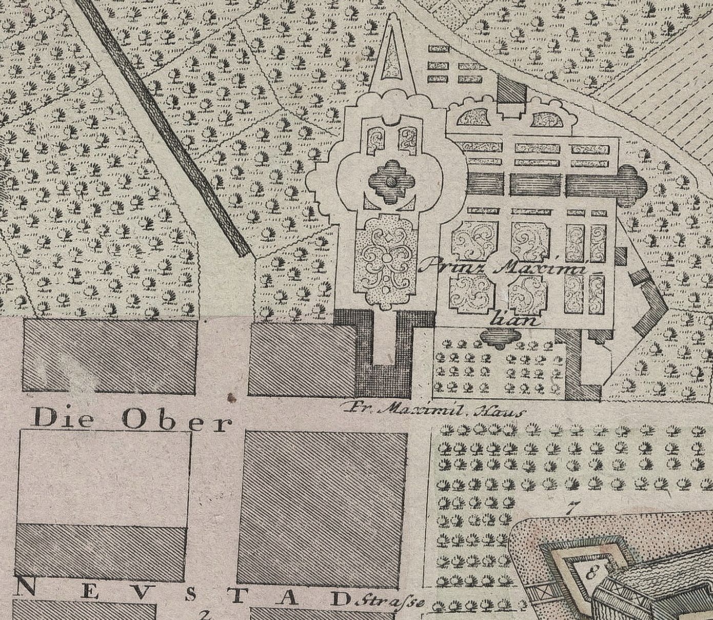 Das Prinz Maximilian Palais ist eine eindrucksvolle barocke Anlage in der Oberneustadt, dicht an der Esplanade vor den Stadtmauern. Auf dem Gebäude-Grundstück steht heute ein Teil der Galeria, der Garten erstreckt sich nördlich über die "Neue Fahrt" hinaus und reicht östlich bis zu den Häusern am Opernplatz.