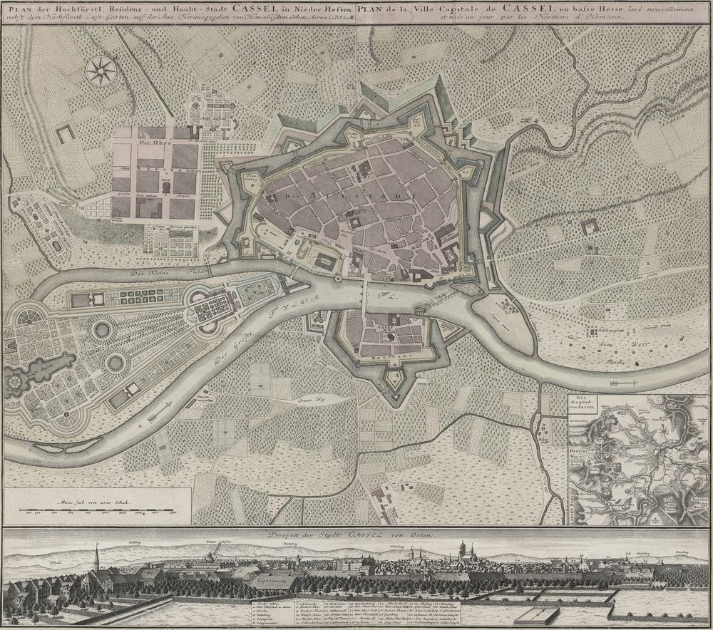 Plan der Hochfürstl. Residenz- und Haubt - Stadt CASSEL in Nieder-Hessen nebst dem Hochfürstl Lust-Garten auf der Aue. Herausgegeben von Homänischen Erben. A 1742 C.R.S.C.M. (Kartenblatt Sammlung FS)