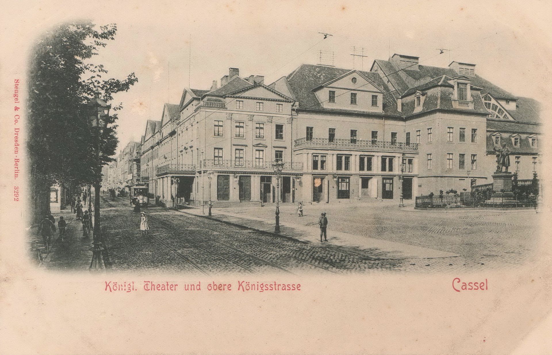 Bild rechts: Foto 1906, links Blick in die Obere Königsstraße. Die Ostseite des Theaters am Opernplatz zeigt den weiträumigen Ausbau des Palais hin zum hohen Bühnenhaus. Am Rand rechts angeschnitten ist das Spohrdenkmal zu erkennen, vor der Auffahrt zum Palais Waitz von Eschen. Postkarte, Sammlung FS