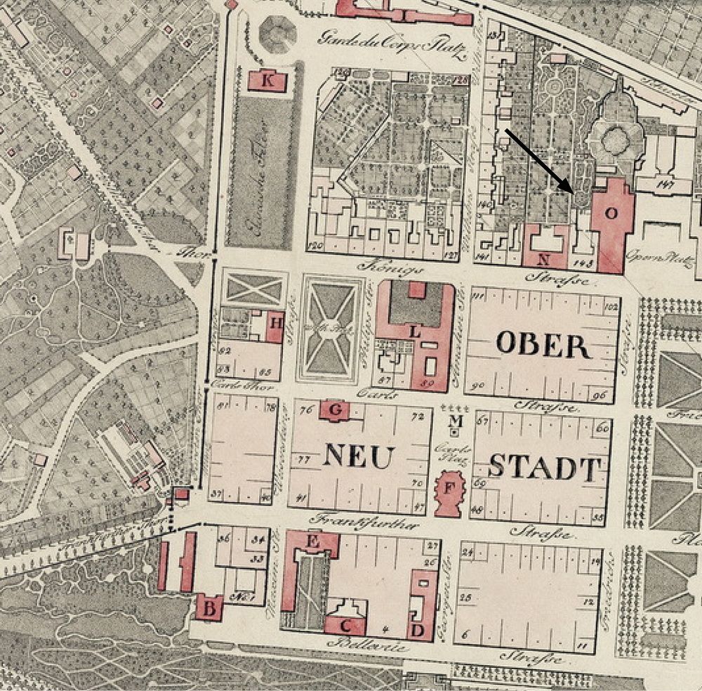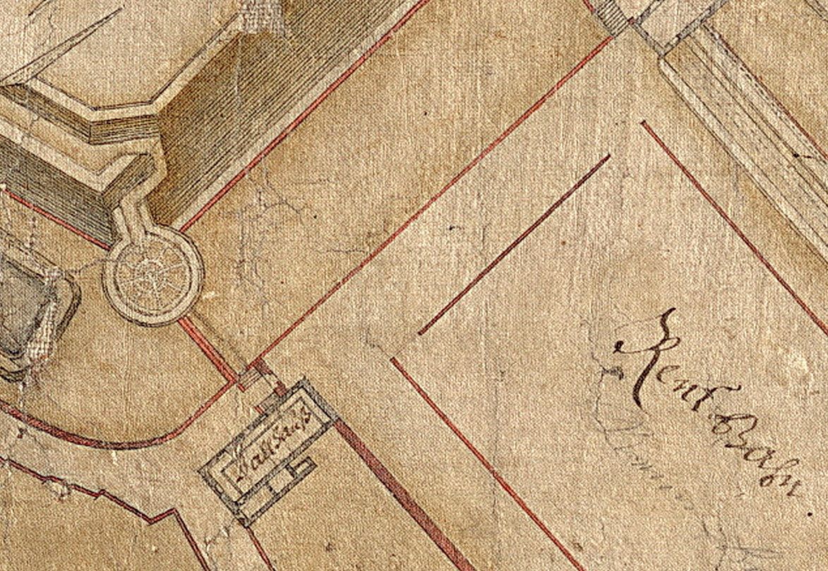 Im Ausschnitt links das "Ball Hauß", an der nördlichen Ecke der Reitbahn, nahe am Schloss