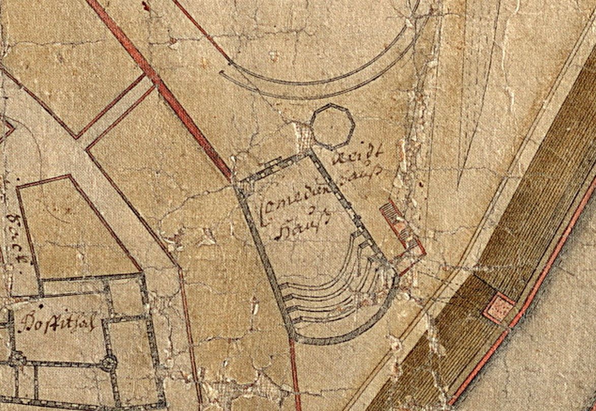 Im Ausschnitt rechts, an der westlichen Ecke das "Comedien Hauß", dicht an der Stadtmauer.
