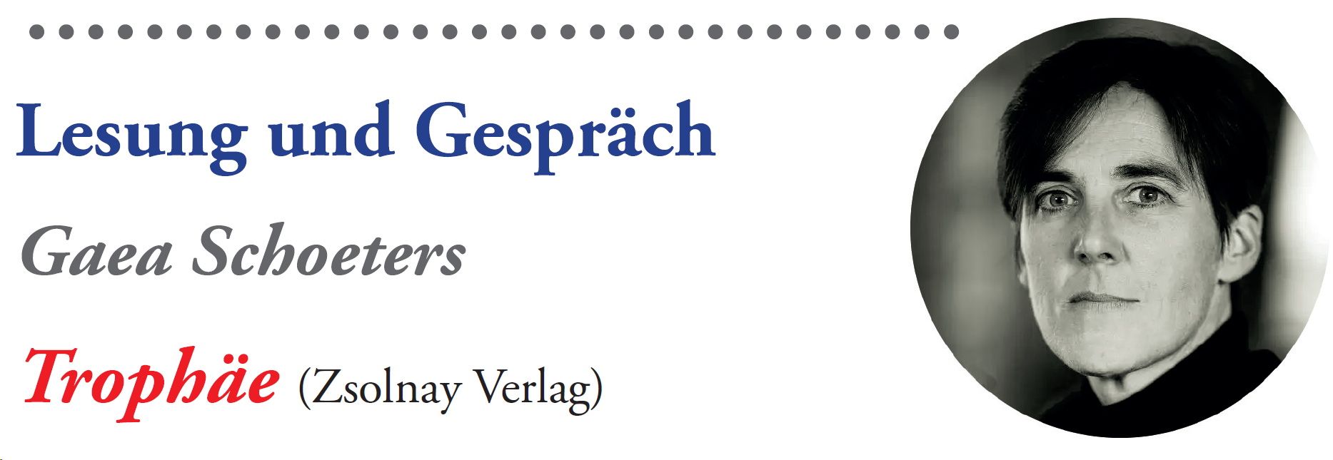 Gaea Schoeters ist eine flämische Autorin, Journalistin und Librettistin und Drehbuchautorin. Für „Trophäe“ wurde sie mit dem Literaturpreis Sabam for Culture ausgezeichnet.